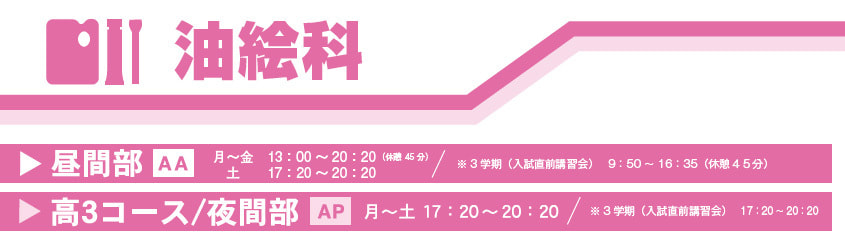 油絵科昼間部は一人一人の目標に合わせて、細やかで丁寧な対応を心がけています。個人面接を指導の根幹にし、目標をクリアしていくためにバラエティーに富んだカリキュラムを生徒の個性に合わせて用意しています。授業は、それぞれが理解できるまでしっかりとコミュニケーションをとって進めていきます。少人数制のクラスだからこそ、きちんと一人一人を丁寧にケアして生徒の目標を確実に達成させることが出来るのです。30 年以上の歴史の中で、合格率はもちろんのこと、夢を形にできた満足率はムサ院の油絵科がどこよりも一番です。