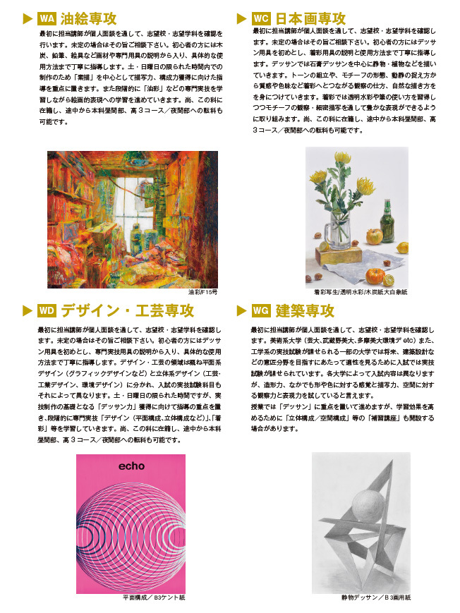 近年、推薦入試における各大学の選抜方法も多様化し、作品等の提出を求める大学もあります。これらの入試状況に対応するためには、入試情報の正確な把握とそれに即した的確な指導が求められます。各自の志望校に合わせた綿密なプログラムを組み指導を進めます。