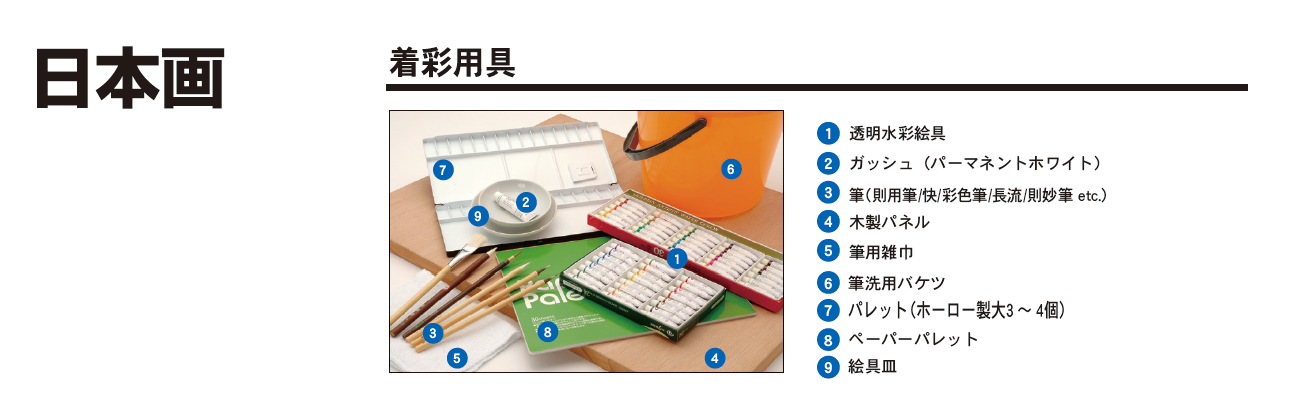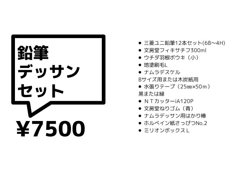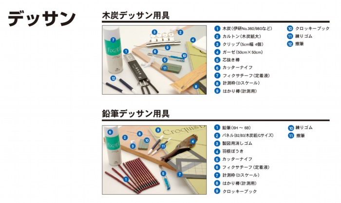 本学院画材部“合格堂”では市価よりも安い値段にて画材を販売しています。初めて実技を勉強する場合には各実技科・コースに合わせて用具一式セットなども扱っていますので、希望の方は画材部“合格堂”にて購入して下さい。ご希望の方には通信販売を行っています。