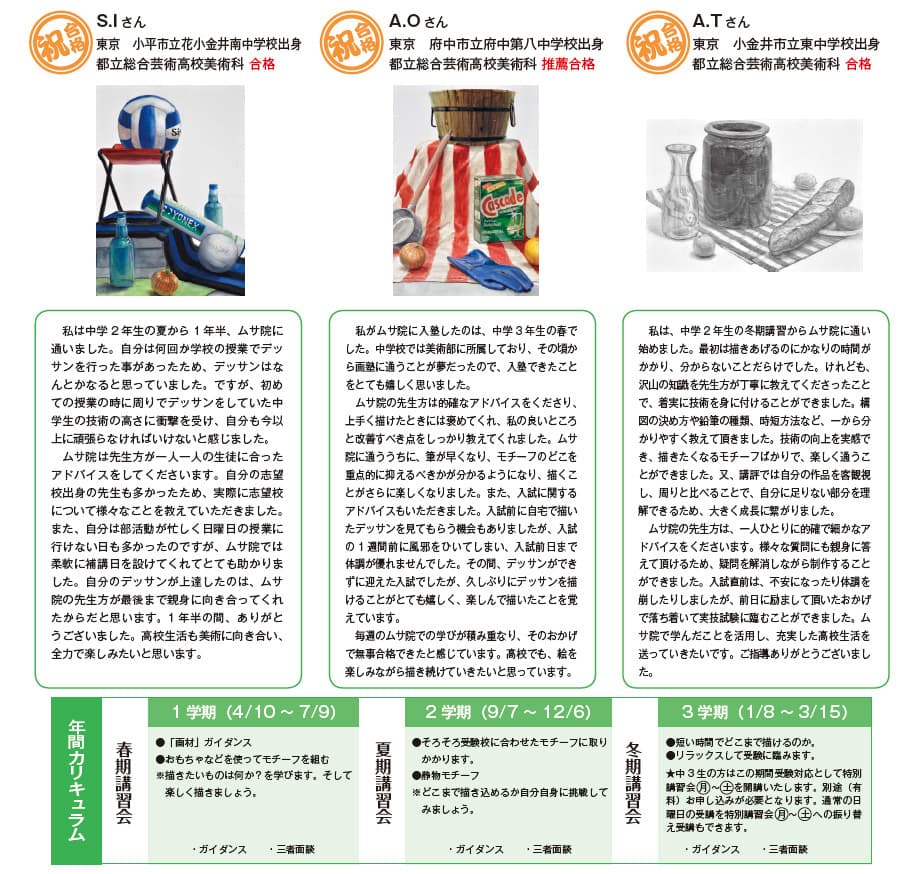 思わず描きたくなる楽しいモチーフから始め、鉛筆や水彩用具の使い方などをしっかり学びながら“目標達成”を目指します。初めての方でも、用具の揃え方から扱い方まで丁寧に説明しますので安心して受講できます。もちろん高校受験以外でも、楽しく絵を描いてみたい人や教養として美術を学びたい人にも色々なカリキュラムを用意しています。