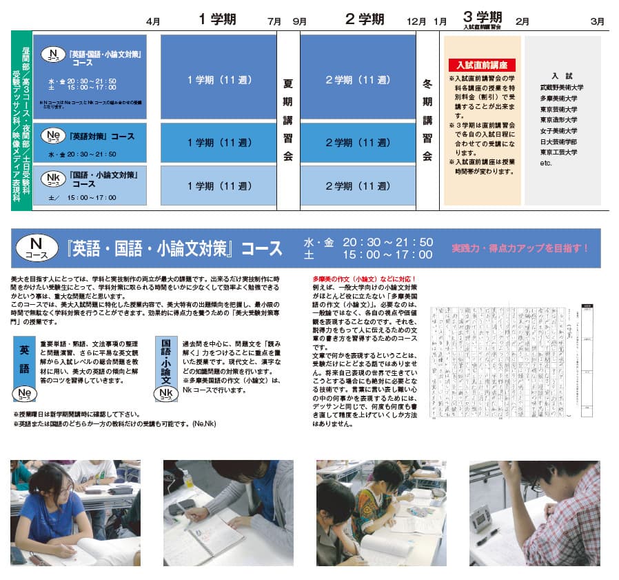各美大の入試問題の内容や形式など、少しずつ変わってきている部分もありますが、受験生が知っていなければならない基本的な部分は変わっていません。自分はそれを知っているのか知らないのかを確認しなければなりませんし、知らなければ覚えて引き出せるようにしなければなりません。「基本=やさしいこと」と考えてしまいがちですが決してそうではありません。自分が知らなかったことや難しいと思うようなことが、実は入試では「基本」だったりします。各コースの授業では、武蔵美、多摩美などの私立美大及びセンター試験で過去に出題された問題や基礎からステップアップすべく編集された教材を用い、実践的な問題演習と解説によって目指す入試の攻略を図ります。「実技力は確実に上がったのに学科の対策をしていなかった。」とか「実技は文句無しの点数が取れたのに学科でダメだった。」などと後で後悔することのないよう、学科対策は各自の習得レベルによらず全ての受験生にとって必須のものと考えしっかりと継続して受験に必要な学習していきましょう。