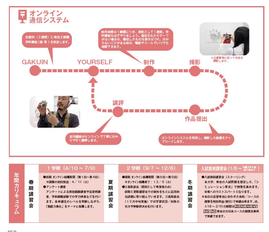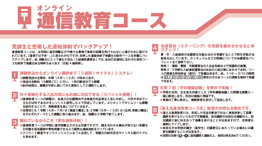 通信教育コースは、本学院に通学困難な方や様々な事情で直接の指導を受けられない人達のために設けられています。 「通信では不安…」と思われがちですが、充実した連絡体制で受講生の制作ペースを完璧にバックアップしますので安心して受講して下さい。尚、受験生にとって最も大切な“入試直前講習会”では各自の志望校に合わせた実技コースを無料で受講出来る特典もあります。